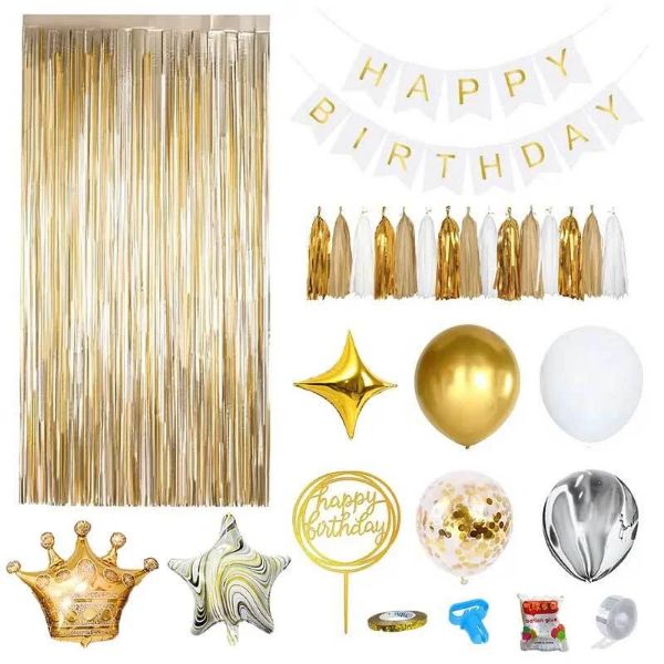60 balona različitih boja; 1x balon u obliku krune; 2x balona u obliku petokrake zvezde; 2x balona u obliku četvorokrake zvezde; 1x zavesa od sjajnih traka; 1x zastava Happy Birthday; 5x seta dekorativnih resa u boji; 1x dekoracija za tortu Happy Birthday; dekorativna traka, pribor za vezivanje balona, lepak i traka za pričvršćivanje balona.