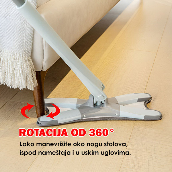 Fleksibilna i savitljiva glava mop-a lako doseže uske prostore—ispod nameštaja, iza toaleta, oko nogu nameštaja i u uglove—tako da vi ne morate.