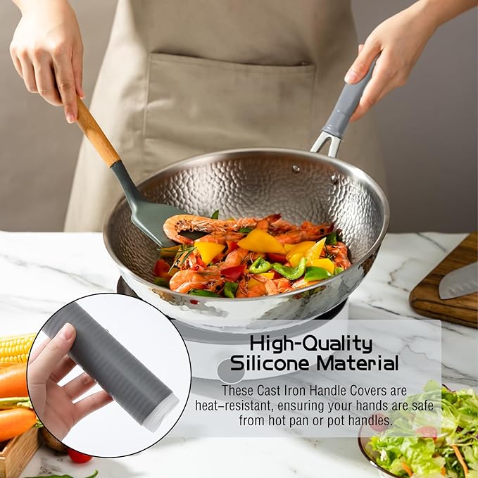 Osigurajte da su drške lonaca i tiganja zaštićene našim vatrootpornim silikonskim poklopcima, dizajniranim da se savršeno prilagode drškama različitih veličina.