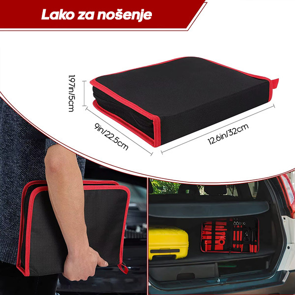 Pogrešno postavljanje alata može biti neugodno i dugotrajno. Komplet dolazi s prijenosnom torbicom s patentnim zatvaračem, u kojoj su svi alati organizirani i laki za nošenje, tako da nikada više nećete izgubiti niti jedan komad.